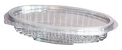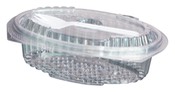 Caixas ovais com tampa bisagra incorporada, produzidas em PET ou PP, para alimentos que têm um elevado volume de liquidos: saladas com molhos, saladas de fruta, sobremesas, carnes etc.